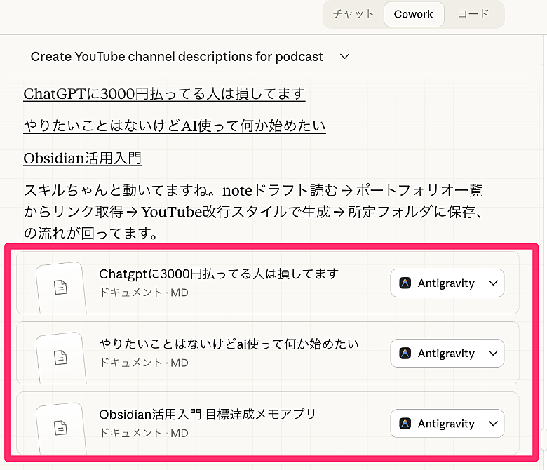 Claudeアプリには「Cowork」っていう機能があります。自分のパソコンのフォルダを指定して、「ここのファイルを使ってレポート作って」と言うだけ。