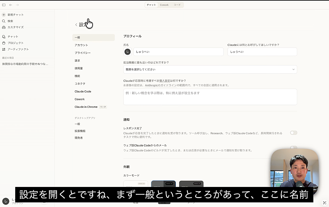 5. 動画②:Claudeアプリの設定画面解説