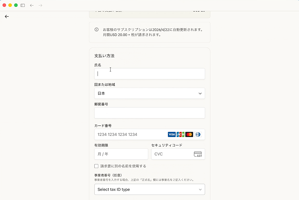 Proプランを選ぶとクレジットカードの入力画面になります。