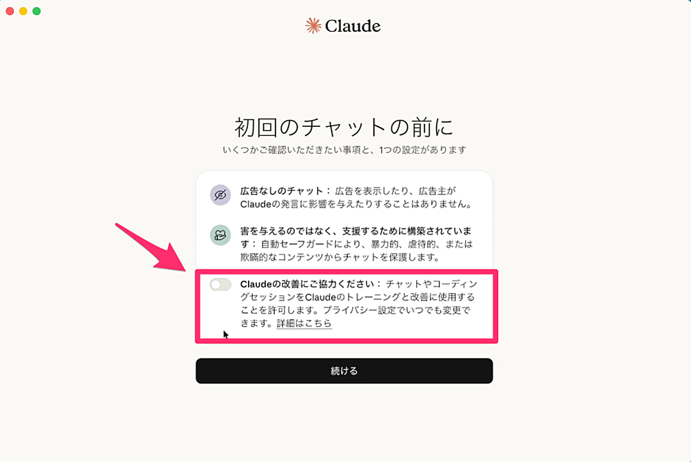 「Claudeの改善にご協力ください」という画面が出ます。チャット内容をAIのトレーニングに使うかどうかの設定です。