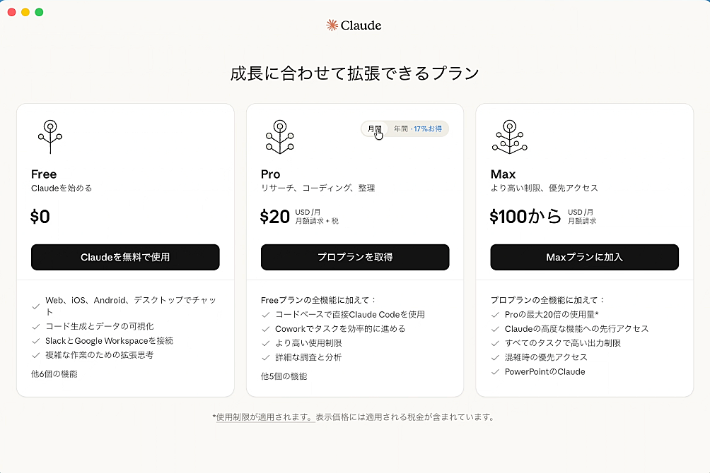 週の使用制限に頻繁に引っかかるなら、1週間待つか、MAXプランに上げてみてください。MAXは100ドルと200ドルの2種類あります。